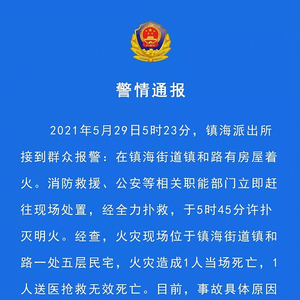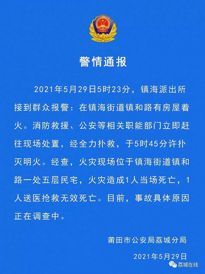 据“荔城在线”微信公众号消息,2021年5月29日5时23分,镇海派出所接到群众报警:在镇海街道镇和路有房屋着火。消防救援、公安等相关职能部门立即赶往现场处置,经全力扑救,于5时45分许扑灭明火。经查,火灾现场位于镇海街道镇和路一处五层民宅,火灾造成1人当场死亡,1人送医抢救无效死亡。目前,事故具体原因正在调查中。