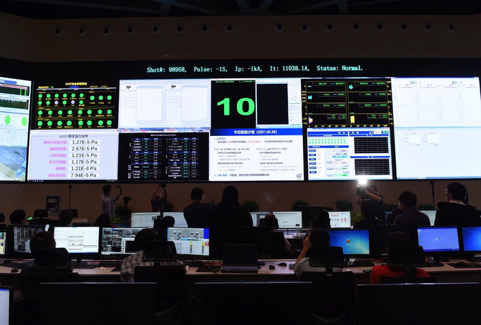 ▲5月28日凌晨,在全超导托卡马克核聚变实验装置(EAST)控制大厅,屏幕显示1.2亿摄氏度等离子体运行突破100秒的瞬间。图片来源:新华社