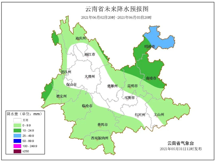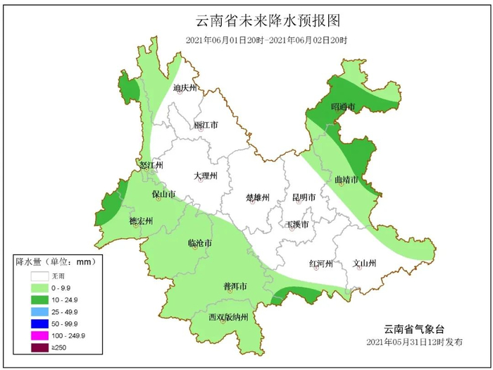 6月1日20时-6月2日20时:昭通南部、曲靖东部阴天间多云有小到中雨,昭通北部、曲靖西部、文山东部、红河南部、普洱、西双版纳、临沧、保山、德宏、怒江西部、迪庆西部多云有阵雨局部中雨,其他地区晴间多云。