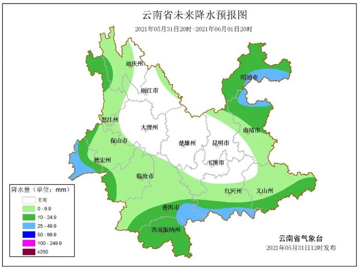5月31日20时-6月1日20时:昭通、曲靖北部阴天间多云有小到中雨局部大雨,曲靖南部、文山、昆明东北部、红河中南部、普洱、西双版纳、临沧、保山、德宏、怒江、迪庆西部多云有阵雨局部中雨或大雨,其他地区晴间多云。