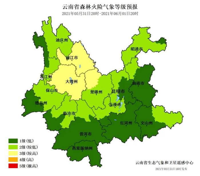 预计未来24小时,丽江、大理、楚雄西北部3级(较高),其他地区1~2级(较低)。