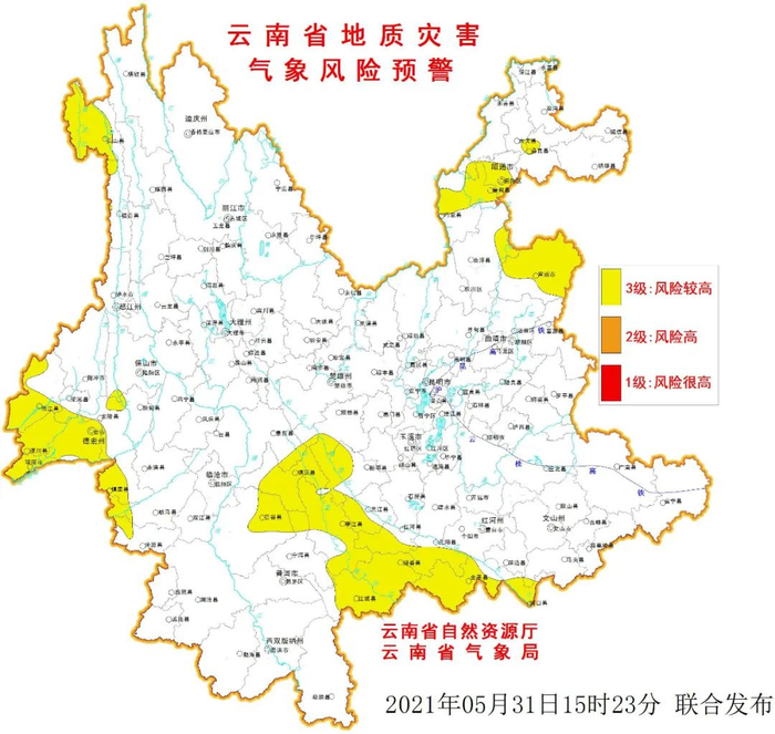 5月31日20:00~6月1日20:00,滇东北昭通市局部、曲靖局部、滇西北怒江州局部、滇西德宏州局部、临沧市局部、滇南普洱市局部、红河州局部、滇中楚雄局部发生滑坡泥石流的风险较高。