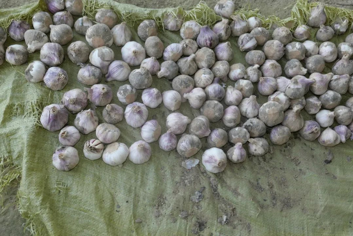 ▲徐伟父亲在门外晒的大蒜。