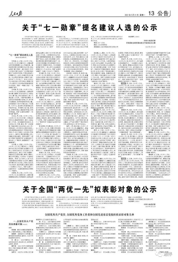 今天,中共中央组织部、党和国家功勋荣誉表彰工作委员会办公室对“七一勋章”提名建议人选进行公示,公示时间为2021年5月31日至6月4日;中共中央组织部对全国“两优一先”拟表彰对象进行公示,时间为2021年5月31日至6月4日。