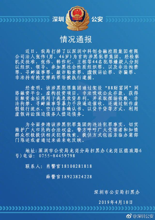 2018年,张伟因涉黑被调查。深圳警方于2019年4月10日发布情况通报,宣布成功打掉了以深圳中科创金融控股集团有限公司法人代表张伟为首的涉黑犯罪集团。