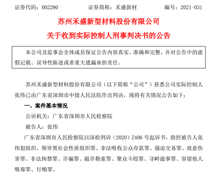 5月31日晚间,A股上市公司禾盛新材发布公告称,公司实控人张伟已由广东省深圳市中级人民法院作出一审判决:数罪并罚,决定执行无期徒刑,剥夺政治权利终身,并处没收个人全部财产,罚金1217万元。