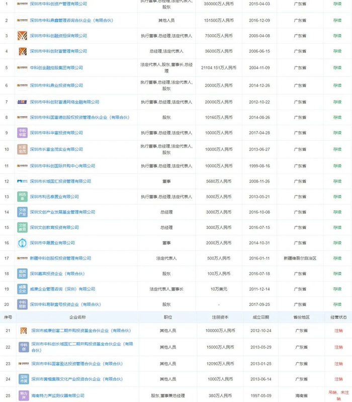 张伟任职于26家企业,其中,在中科创资产、深圳市中科鼎业投资有限公司、深圳市中科创财富通网络金融有限公司等公司担任执行董事、总经理、法定代表人职务。