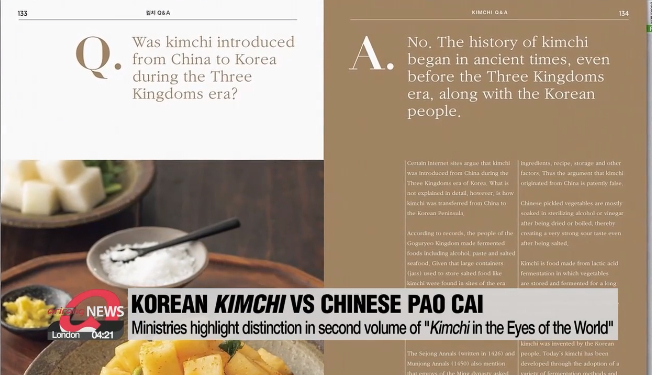 (观察者网讯)根据韩国阿里郎电视台(Arirang TV)6月2日报道,韩国政府近日出版了一本宣传韩国泡菜的书籍《世界眼中的韩国泡菜》(Kimchi in the Eyes of the World)。该书包含了韩国海外侨民和海外文化中心对韩国泡菜文化的体验,也介绍了韩国泡菜(kimchi)和中国泡菜(pao cai)之间的区别。