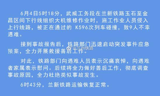 原标题:兰新铁路发生事故致9人死亡 兰州铁路回应