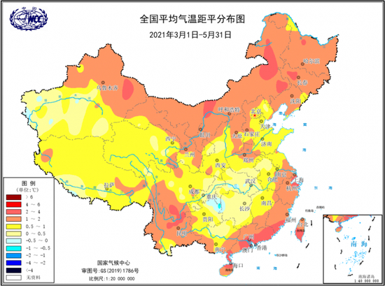 2021年春季(3月1日-5月31日),全国平均气温11.6℃,较常年同期(10.4℃)偏高1.2℃,为1961年以来历史同期第四高。全国大部地区气温较常年同期偏高0.5℃以上,其中东北及内蒙古大部、华北中西部、西北北部、江南东部、华南大部、西南中南部偏高1~2℃,局地偏高2℃以上。广东平均气温为1961年以来历史同期最高,云南、浙江、上海、海南为次高,福建为第三高。
