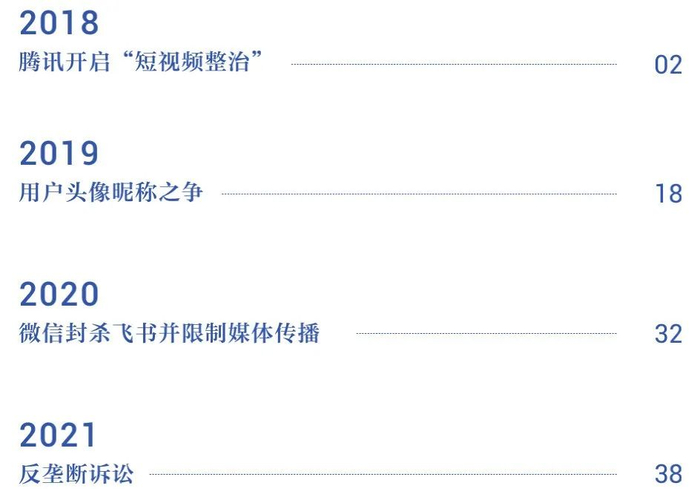 据券商中国记者梳理,此次字节跳动公布的《字节跳动遭遇腾讯屏蔽和封禁大事记(2018-2021)》共有52页,选取了46个代表性时间点,按照时间顺序将双方之间的纷争划分为四个章节,分别是2018年腾讯开启“短视频整治”、2019年用户头像昵称之争、2020年微信封杀飞书并限制媒体传播、2021年反垄断诉讼。