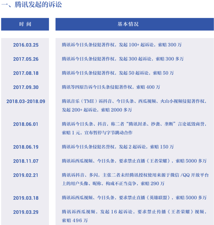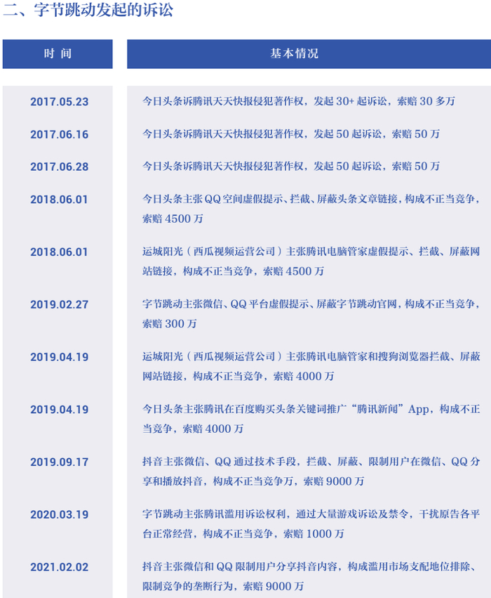 值得注意的是,根据字节跳动公布的资料,自2016年3月腾讯起诉今日头条侵犯著作权以来,双方在五年时间内已经发起了35次合计近千起诉讼,具体清单如下。