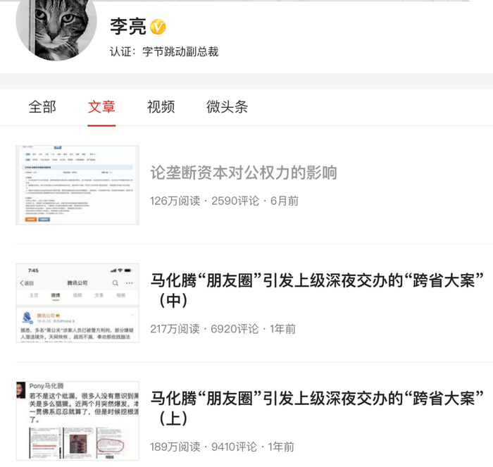 李亮近两年也多次在今日头条平台发布微头条及文章,攻击腾讯利用垄断资本影响公权力,进而打击反垄断。从数据来看,李亮发布的三篇相关文章,最高获得了217万阅读,最低的也有126万阅读。