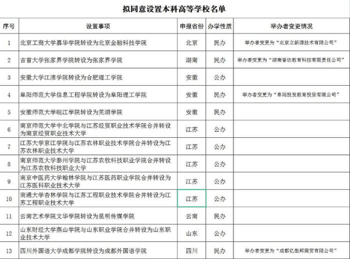 ☞ 教育部拟同意13所独立学院转设为本科学校并公示名单