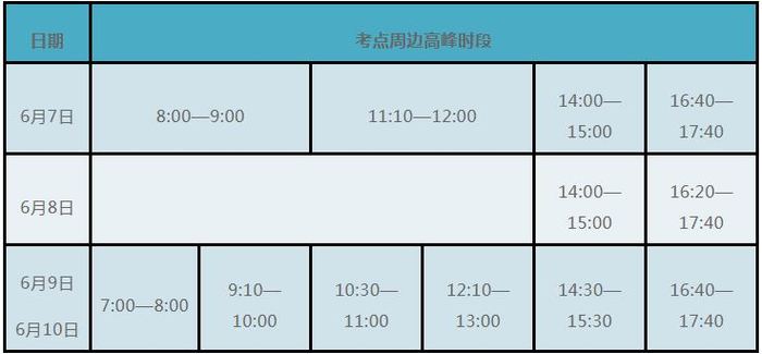 预计6月7日8:00-9:00、11:10-12:00、14:00-15:00、16:40-17:40四个时段,6月8日14:00-15:00、16:20-17:40,两个时段;6月9日和10日7:00-8:00、9:10-10:00、10:30-11:00、12:10-13:00、14:30-15:30、16:40-17:40六个时段考点周边道路通行压力较大。