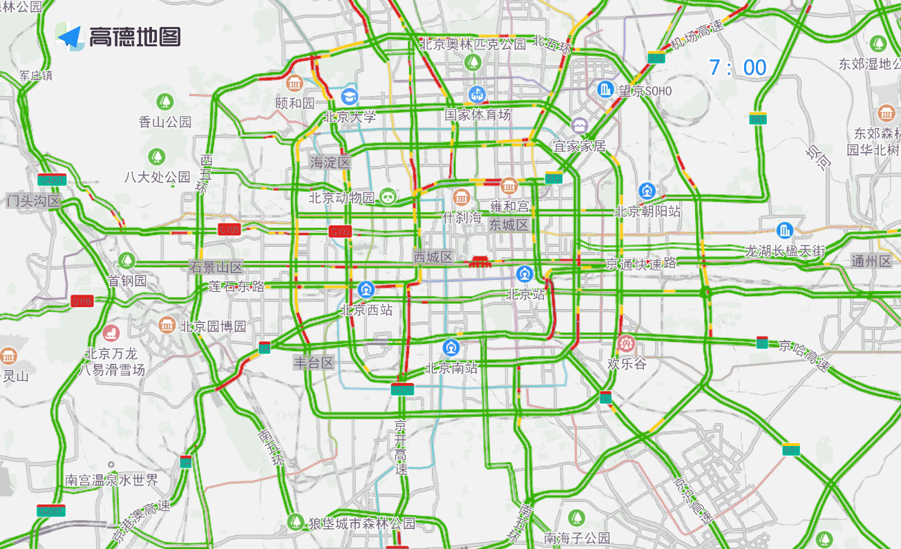 早高峰期间,二、三、四环,东、西、北五环,东六环,菜户营南路、建外大街、建国路、通惠河北路、西直门北大街、万泉河路、莲石东路等道路进城方向将出现车行缓慢的情况;高速公路方面,京藏高速、京承高速、京通快速、京港澳高速、机场高速等将出现进京潮汐车流,预计最高峰出现在8:00-8:30。