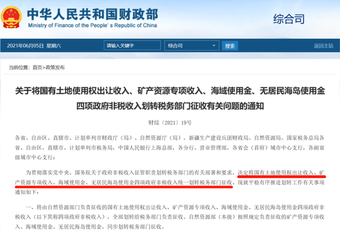 近日,财政部发布《关于将国有土地使用权出让收入、矿产资源专项收入、海域使用金、无居民海岛使用金四项政府非税收入划转税务部门征收有关问题的通知》。而“国有土地使用权出让收入”一词让该通知一时间成为财经领域热议的话题。