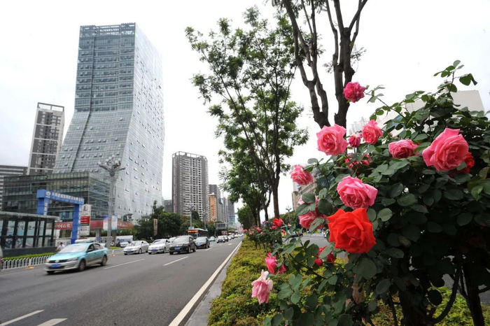 红塔东路、广福路等路段除种植树状月季外,还搭配了木春菊、红花檵木、海棠、美女樱等植物,形成了百花齐放、生机盎然的美丽画卷。