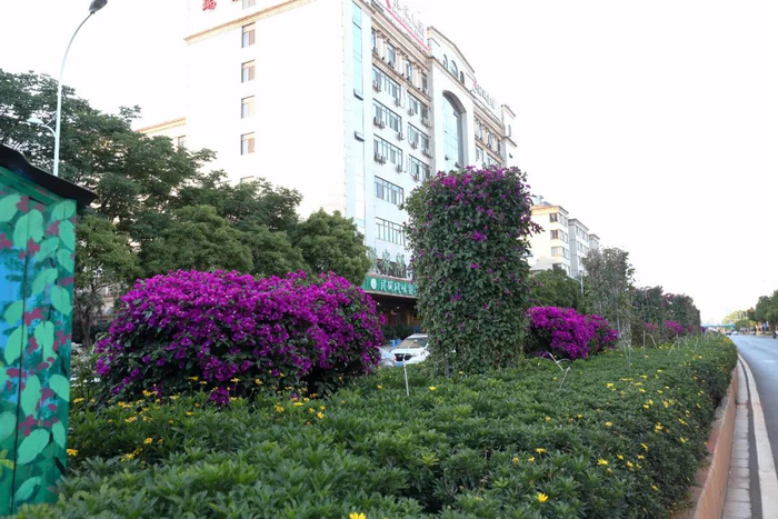 日新中路中央绿化带除了成片种植树状月季3516株外,从陆家路交叉口开始,中央绿化带中间种植了几乎同一规格大小的522株三角梅灌木球,形成了花卉连片盛开的景观大道。此外,日新路、福海立交、西福路及广福路等重要城市道路沿线及交叉口处也摆放了大量三色堇、金盏菊、虞美人及欧报春等时令花卉,同时不断引进推广新优特色花卉,种植了大花月季、树状月季、金鱼草、巨无霸海棠及彩叶苏等新品种,都具有较高的观赏效果。