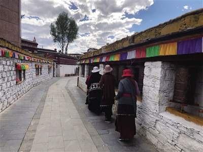 5月底,四川甘孜理塘县城中心的仁康古街,三三两两的游客走过藏房,在小广场上晒着太阳。穿着民族服装的藏民念着经文,穿过正在参观的游客,围着转经筒一圈圈转着。中午时分,旅行团的集中到来让古街喧闹起来,人流不断但并不拥挤。每天12点到15点是这里最热闹的时段,古街边的道路两旁停满了旅游大巴。