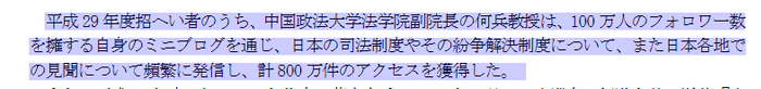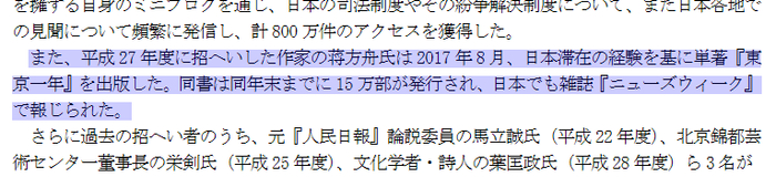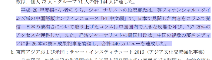 “2016年(平成28年度)的受聘者中,段宏庆在英国《金融时报》中文版新闻网上以专栏形式发表在日见闻,关于夸赞日本卫生问题的文章在中国获得了737万次的点击量。另外,马国川向中国的多家著名媒体投稿了26篇访日成果报道,总计达到了440万点击量。”