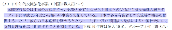 据报告介绍,所谓“中日知识分子交流加强”,就是日方从2008年(平成20年)开始寻找并聘请这些在中国舆论场具有较大影响力的知识分子,为他们提供体验日本生活学习的机会,使其与日本各界人士接触,然后通过他们在中国的发声,促进中国社会对日本的理解。