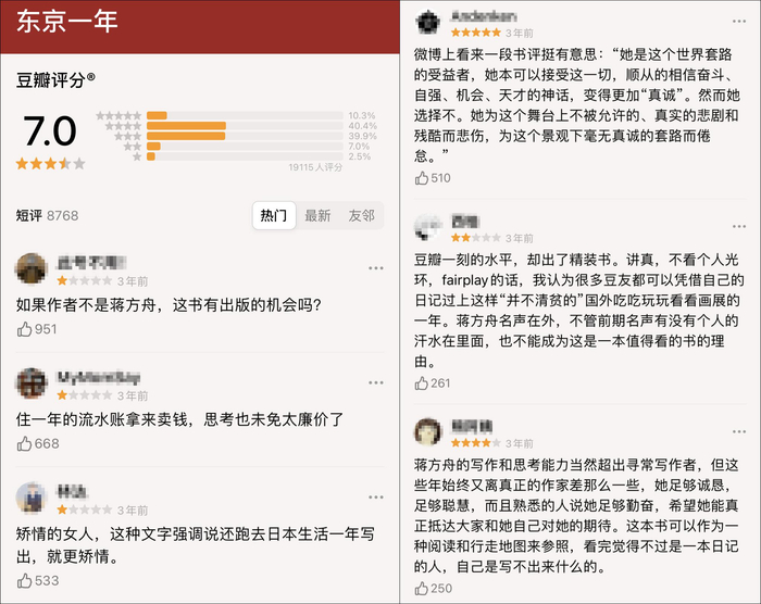 该书在豆瓣上的评价不算高,只有7分,打分以三星和四星居多,而热门评论也几乎以中差评为主。
