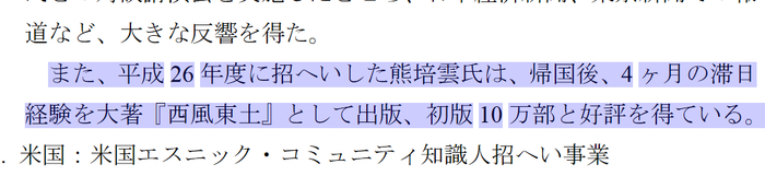 “2014年度(平成26年度)受聘的熊培云,回国后将留日经历经验写成《西风东土》出版,初版10万册,大受好评。”
