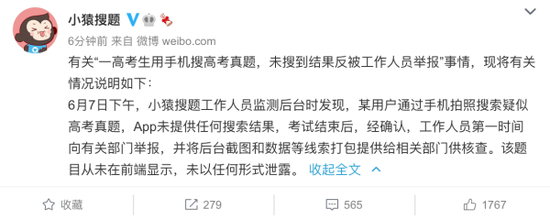 据@小猿搜题声明,6月7日下午,小猿搜题工作人员监测后台时发现,某用户通过手机拍照搜索疑似高考真题,App未提供任何搜索结果,考试结束后,经确认,工作人员第一时间向有关部门举报,并将后台截图和数据等线索打包提供给相关部门供核查。该题目从未在前端显示,未以任何形式泄露。