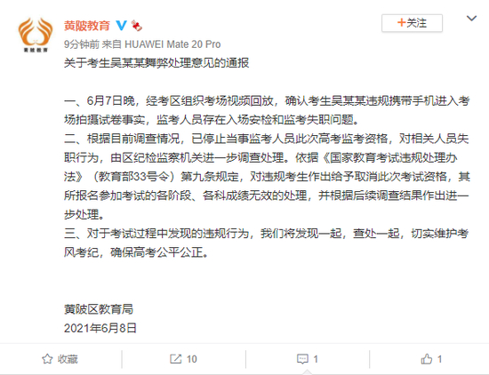 武汉黄陂区教育局:关于考生吴某某舞弊处理意见的通报