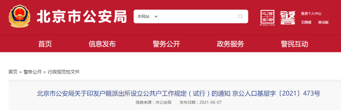 近日,北京市公安局出台了《北京市公安局户籍派出所设立公共户工作规定(试行)》(以下简称《规定》),于2021年6月1日起执行。