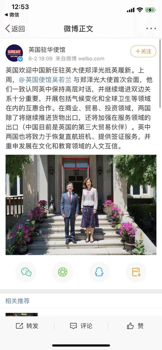 另据“英国驻华使馆”官方微博消息,吴若兰与郑泽光上周已首次会面。在该条微博的评论中,许多网友期待两国能够早日恢复直航。