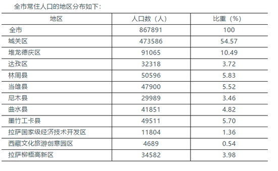 根据《全国人口普查条例》和国务院的决定,以2020年11月1日零时为标准时点开展了第七次全国人口普查[2],按照国务院、西藏自治区第七次全国人口普查领导小组统一部署,我市第七次全国人口普查工作在市委、市政府正确领导下,通过全市各级政府和普查机构及全体普查员的艰苦努力、无私奉献,广大普查对象共同参与、积极配合,圆满完成了拉萨市第七次全国人口普查的各项任务。现将西藏自治区第七次全国人口普查办公室审核反馈的主要数据公布如下: