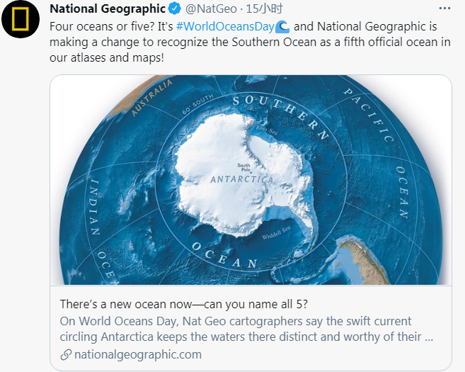 美国《国家地理》杂志官方推特8日刊文称,“四大洋还是五大洋?今天是世界海洋日,《国家地理》正做出改变,在我们的地图册和地图中承认‘南大洋’为官方第五大海洋!”↓