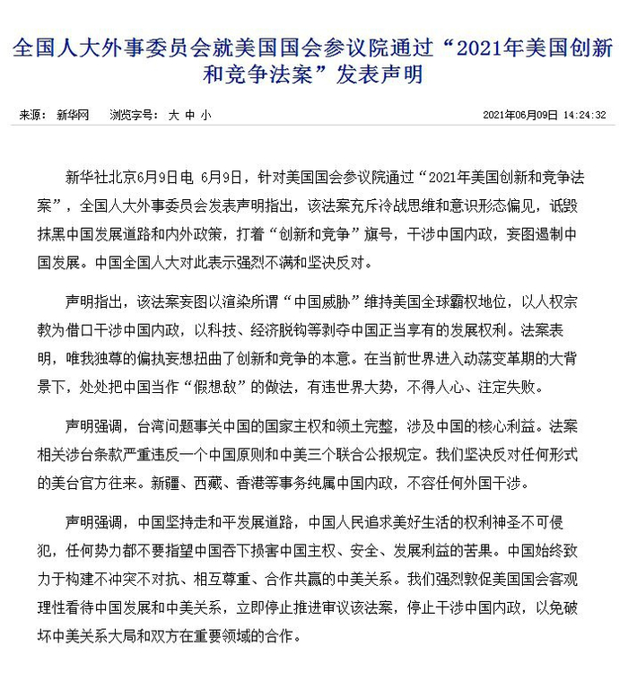 6月9日,全国人大外事委员会发表声明,对这一法案表示强烈不满和坚决反对。强烈敦促美国国会立即停止推进审议该法案,停止干涉中国内政,以免破坏中美关系大局和双方在重要领域的合作。
