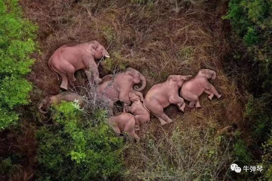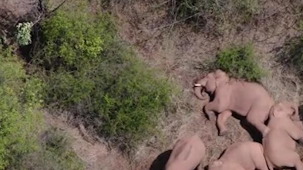 无人机再抓拍北迁象群睡觉:有的象站睡也有的躺睡