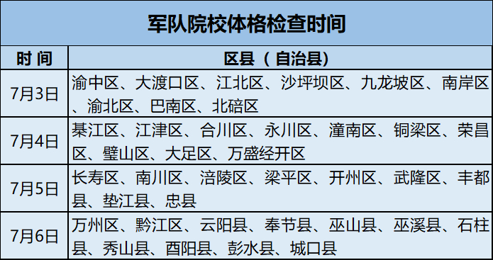 以上时间安排请考生根据本人户籍所在地对应区县(自治县)按时参加,户籍所在地为重庆市以外的按学校所在地对应区县(自治县)按时参加。凡在规定时间内未参加体格检查的考生,填报的军队院校志愿作自动放弃处理。