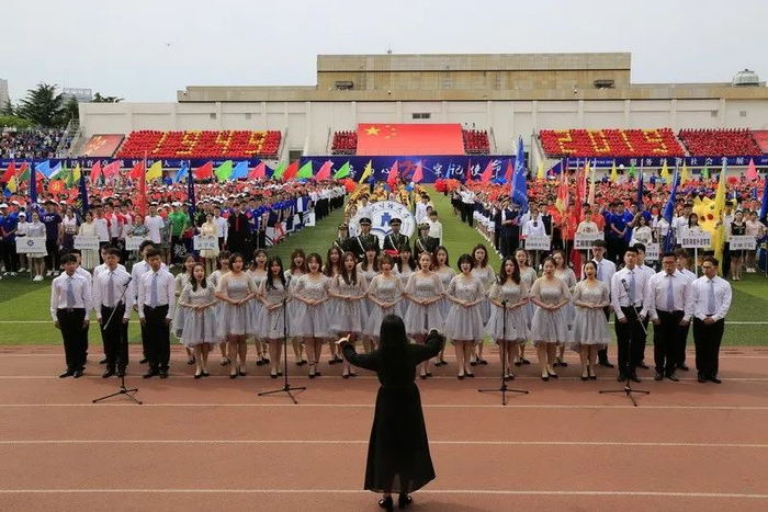 我们在绿茵场上齐聚一堂,感受拼搏的运动力量,现场在阿卡贝拉合唱团领唱下,全校师生同唱一首歌——《我和我的祖国》,用歌声传递对伟大祖国的无限热爱与祝福。