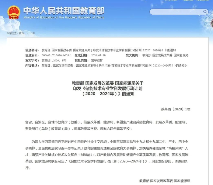 关于印发储能技术专业学科发展行动计划(2020-2024年)