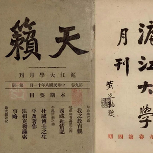 1919年第9卷第1期《天籁》封面的刊名下开始备注“沪江大学月刊”字样(左图);第9卷第4期《天籁》中文刊正式更名为《沪江大学月刊》,刊名由黄炎培题写(右图)