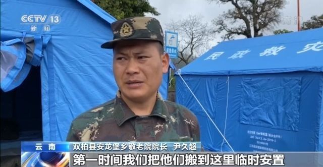 双柏县安龙堡乡敬老院院长 尹久超:第一时间把他们搬到这里临时安置,马上就给他们保障牛奶、矿泉水,还有面包、冷冻食品之类的,就是衣食住行都是有保障的。
