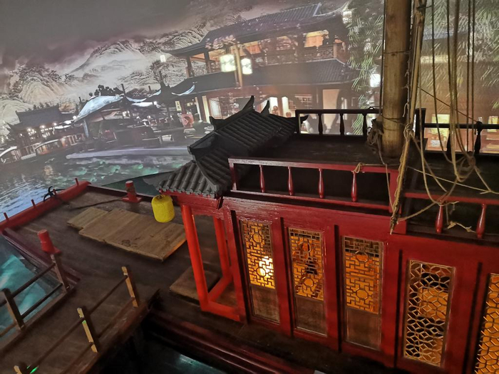 此外,参观者还可以登上一艘长约21米、桅杆高15米的“沙飞船”,在四周投影的带动下,模拟坐船扬帆远行,感受两岸的繁华盛景。相传“沙飞船”是扬州沙氏所造,因跑得快而得名。它是明清时期江南一带的大户人家娶亲或看戏常用的交通工具,也是康熙南巡、乾隆南巡时的御座船之一。