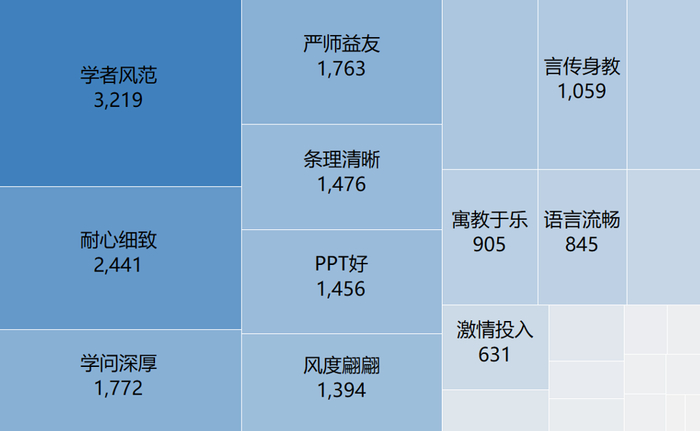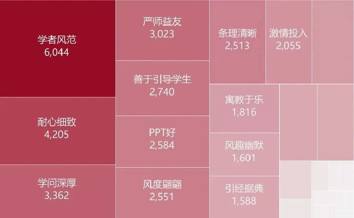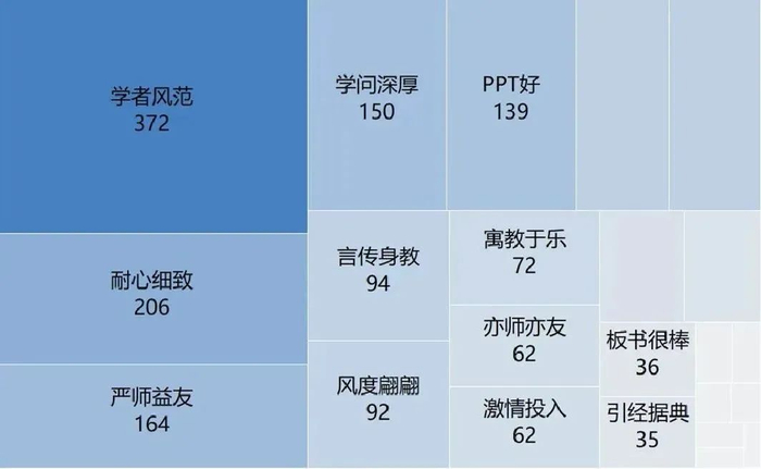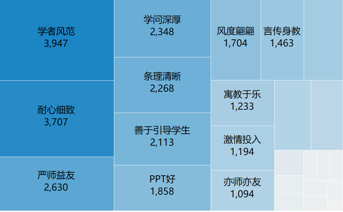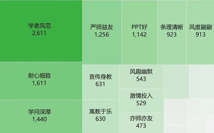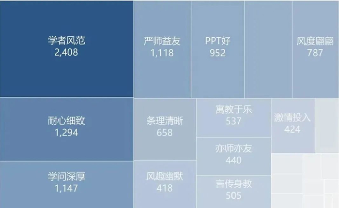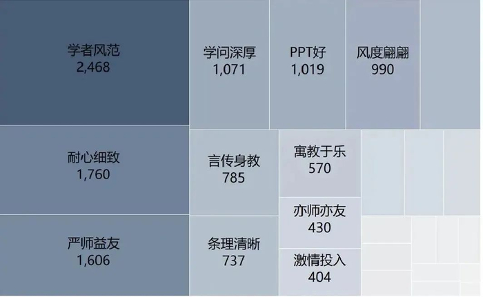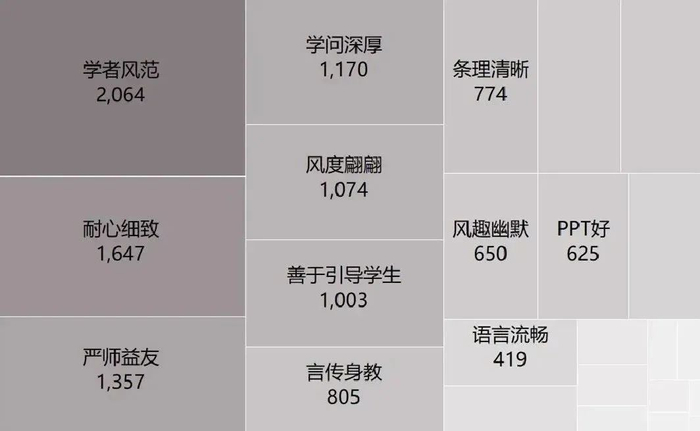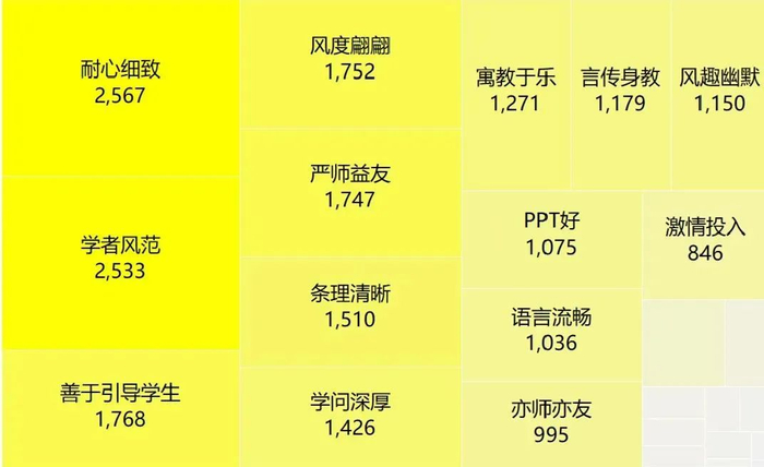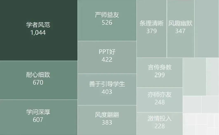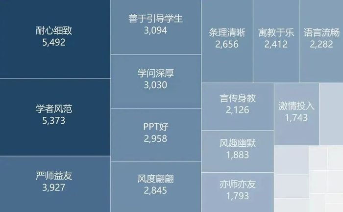 从数据来看,2020-2021学年第一学期中,学生评价的课程共有2967门次。评教结果显示,北林er最爱用的教师个性化标签是【学者风范】,共计使用了49329次,【耐心细致】、【风度翩翩】、【学问深厚】、【严师益友】、【PPT好】也是高频标签。