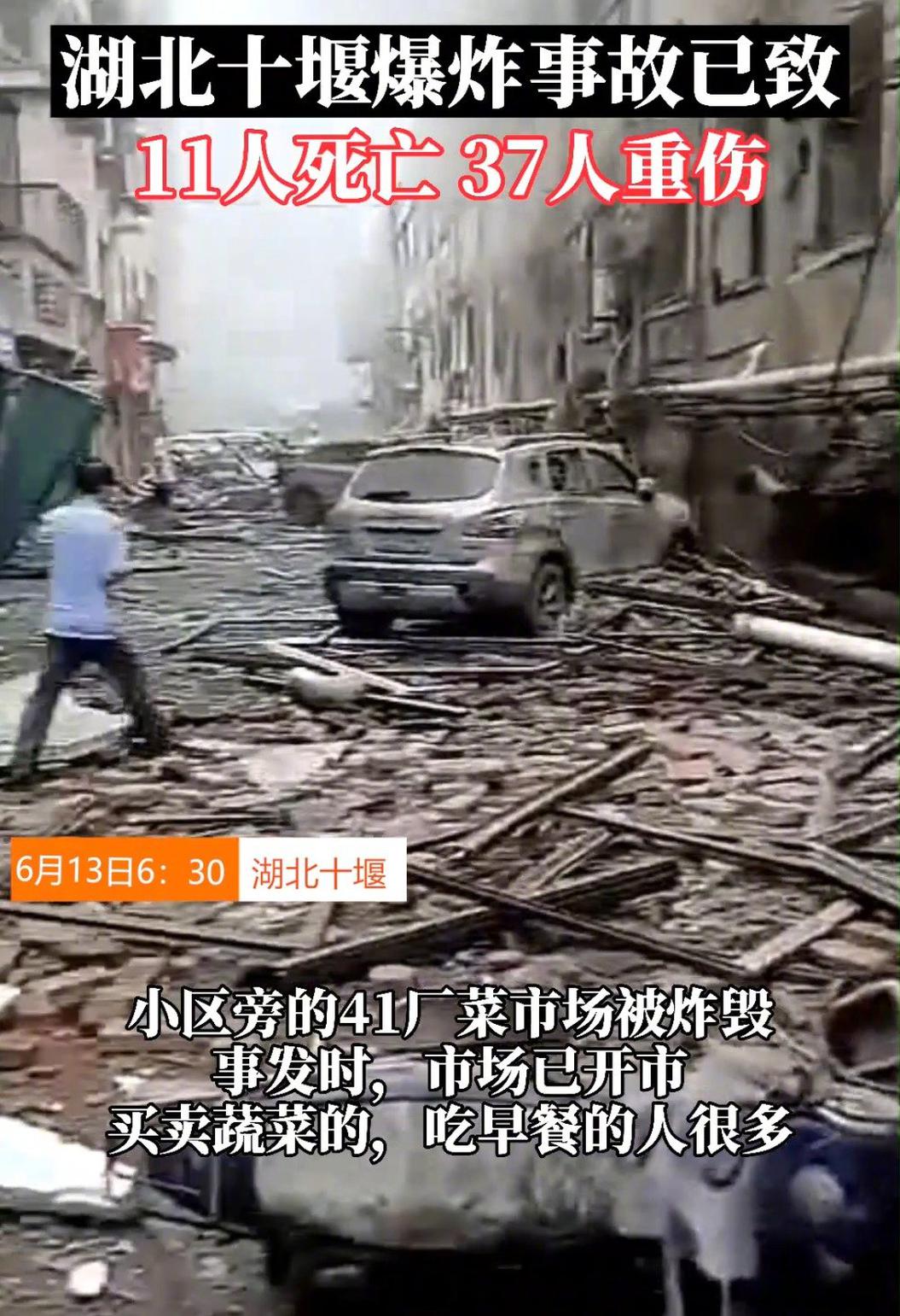 6月13日清晨6时30分,湖北十堰市张湾区艳湖社区艳湖集贸市场发生燃气爆炸事故。截至上午11时,已搜救出144人,目前均在医院接受救治,其中重伤37人,死亡11人。