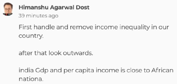 还有网友让印度先管好自己国内问题:“先着手处理和消灭我们国家的收入不平等,然后再向外看。印度的GDP和人均收入跟非洲国家差不多。”