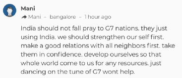 在《印度时报》评论区,有人宣称“非常欢迎”印度这一举动。不过也有网友对此看衰,并表示“印度不应该成为G7的牺牲品,他们只是在利用印度。我们应该先加强自身,先和所有邻国搞好关系……发展自身,这样全世界就会来找我们要资源。按照G7的调子起舞没有用。”↓