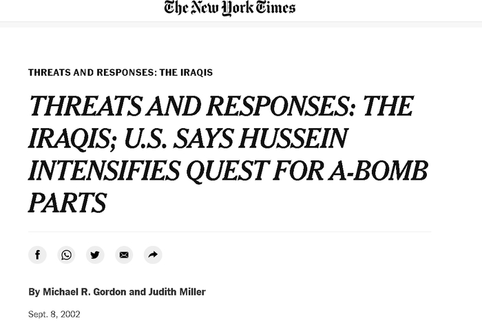 比如,当年和朱迪斯·米勒一同为美国政府捏造了伊拉克有大规模杀伤性武器的《纽约时报》前记者迈克尔 R戈登(Michael R Gordon),就在2007年一篇涉及伊朗的报道上“故技重施”,大量引用来自美国政府的说法宣称伊朗有危险的武器,想以此给当时想要袭击伊朗的美国政府进行舆论造势。