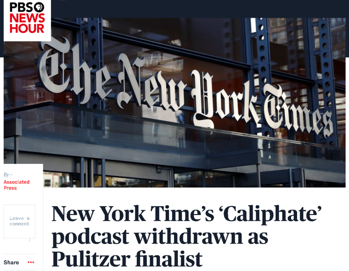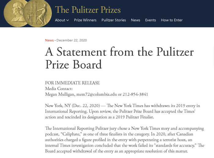 而在2020年时,另一名《纽约时报》的记者鲁克米尼·卡拉马奇,也险些因为编造一组关于中东地区的恐怖组织“伊斯兰国”的报道而获得普利策奖。直到给这名记者提供虚假新闻的一名加拿大籍男子被加拿大警方因“编造涉恐骗局”被捕,《纽约时报》和普利策奖方面这才发现这个很对美国“外宣”胃口的报道出了大问题,撤下了参奖的问题报道。