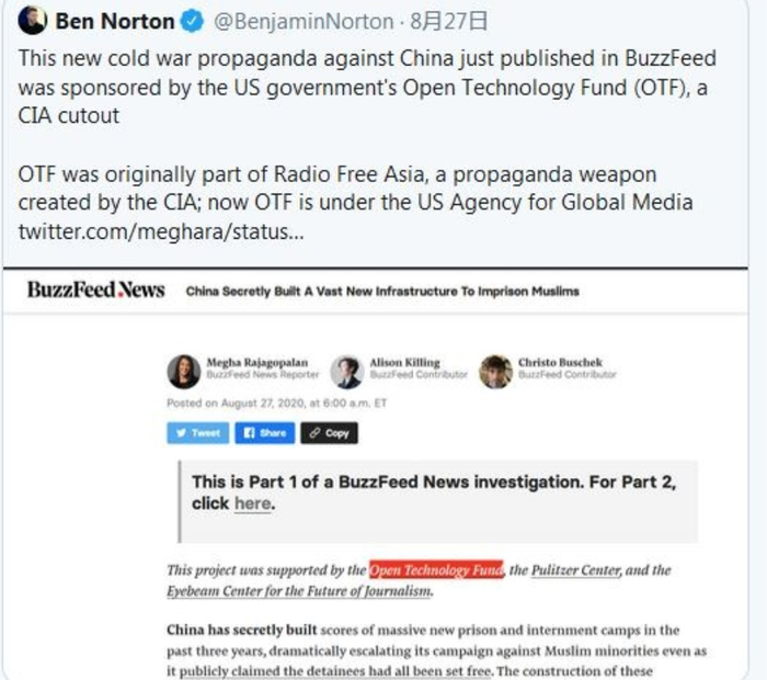 另一家中国媒体“观察者网”也在报道Buzzfeed炮制的这组新疆系列假新闻时指出,这篇报道不仅被中国网民发现漏洞百出,一些外国网民还发现这组报道本身是由美国国务院的“大外宣”机构美国国际媒体署(USAGM)下属的一个名叫“开放科技基金”的项目赞助的,报道中的绝大多数“证据”也是由美国政府资助的反华分子提供的,比如常年抹黑中国新疆政策的德国极右翼宗教分子郑国恩(Adrian Zenz)。