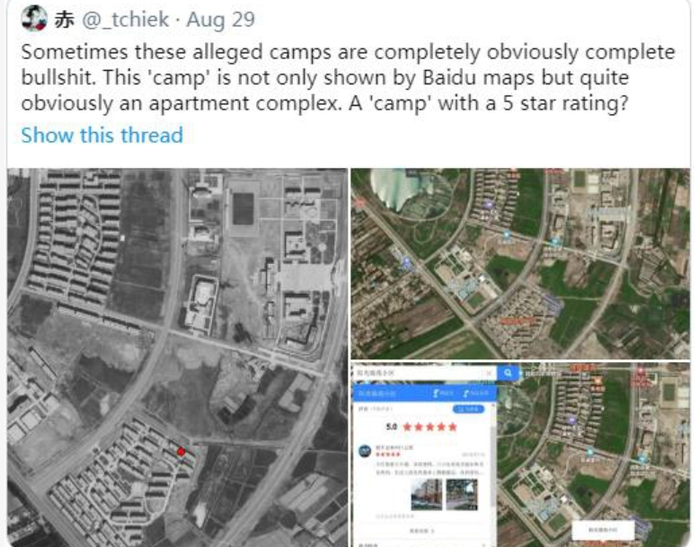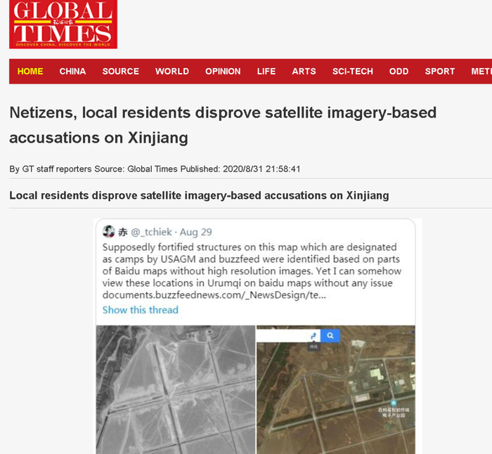 比如我们《环球时报》英文版当时的报道就指出,虽然Buzzfeed的三名记者宣称他们通过“卫星图片”发现了新疆有300多处关押少数民族的“集中营”,可中国网民却通过百度地图发现,这些被Buzzfeed记者列出的地点,要么是当地的工业园区,要么是居民小区。